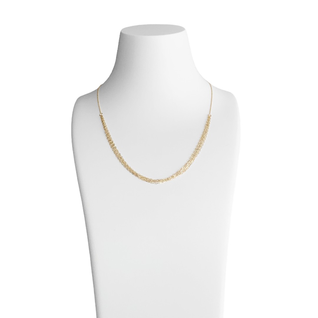 Erleben Sie zeitlose Eleganz mit diesem zarten Collier aus 585 Gelbgold. Diese Goldkette hat eine Gesamtlänge von 45cm und bietet eine Zwischenöse bei 42cm, die es Ihnen ermöglicht, das Collier nach Ihren Wünschen anzupassen.Das markante Merkmal dieses Schmuckstücks ist der vordere Teil, der aus mehreren feinen Ketten besteht. Diese Ketten bewegen sich sanft mit Ihren Bewegungen und erzeugen bei jedem Lichteinfall einen faszinierenden Glanz. Diese Kette verkörpert ein harmonisches Zusammenspiel von Mode und Eleganz und spricht diejenigen an, die feine und filigrane Schmuckstücke schätzen. Setzen Sie ein stilvolles Statement mit diesem atemberaubenden Goldcollier.