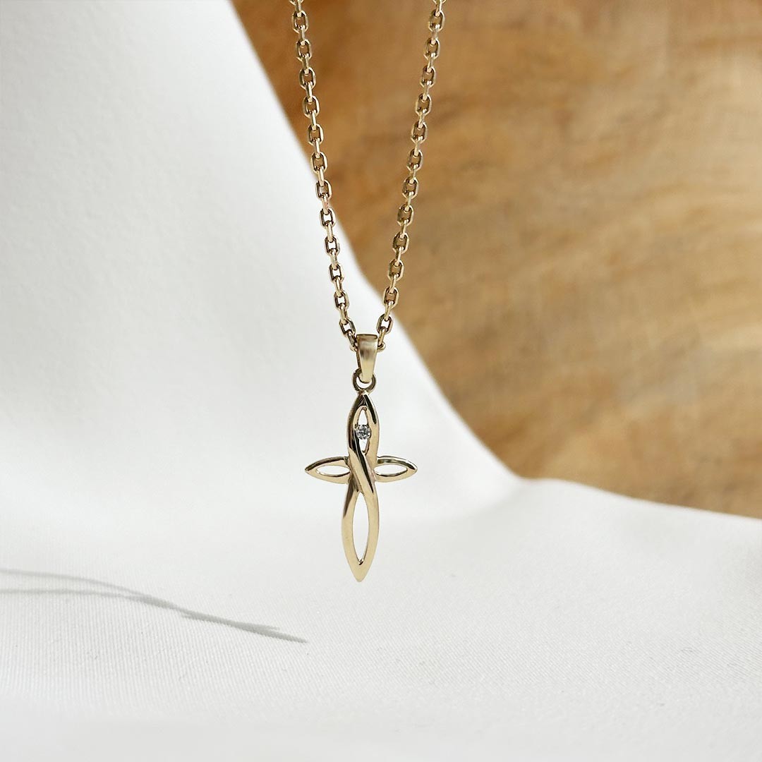 Dieser außergewöhnlich gestaltete Kreuzanhänger aus 585er Gelbgold fällt durch seine moderne Formgebung sofort ins Auge. Die geschwungenen Linien der Kreuzbalken verleihen dem klassischen Symbol eine neue, ästhetisch fließende Anmutung – elegant, klar und zugleich beweglich im Ausdruck. In der Mitte ist der Anhänger durchbrochen, wodurch eine offene Leichtigkeit entsteht. Als funkelnder Akzent ist dort ein farbloser Zirkonia eingefasst, der bei jedem Lichteinfall für ein dezentes Strahlen sorgt. Ein stilvoller Anhänger, der Tradition mit zeitgemäßer Gestaltung verbindet.