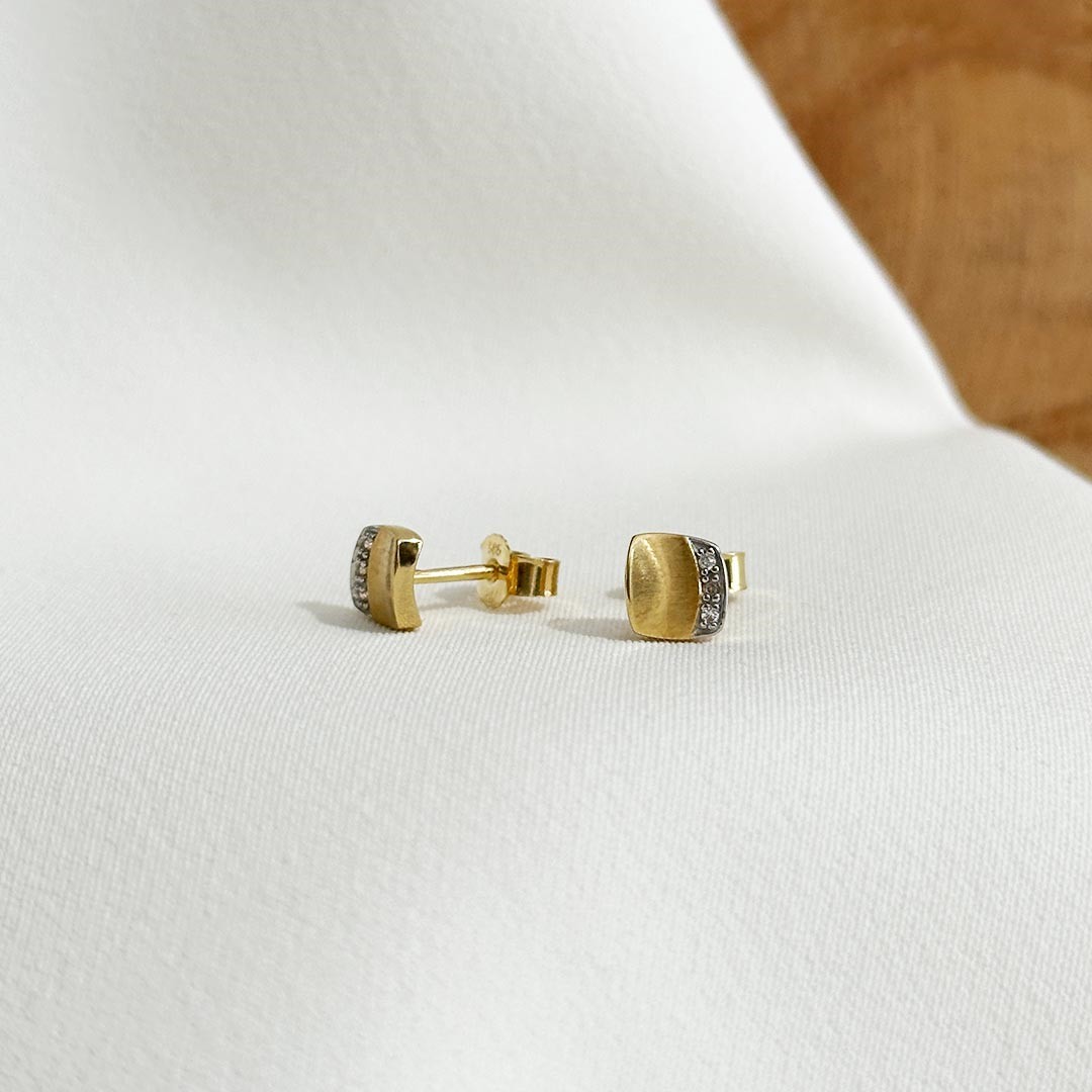 Diese schlichten Ohrstecker aus 585er Gelbgold zeigen sich in moderner, quadratischer Form mit mattierter Oberfläche und vereinen geradliniges Design mit feinem Detailreichtum. Drei funkelnde Zirkonia pro Stecker setzen gezielte Akzente und verleihen dem Schmuckstück eine subtile Eleganz. Mit einer Größe von 6mm sind die Stecker dezent genug für den Alltag, bringen aber dennoch eine raffinierte Note mit – ein stilvolles Accessoire für alle, die klare Formen und zurückhaltenden Glanz schätzen.