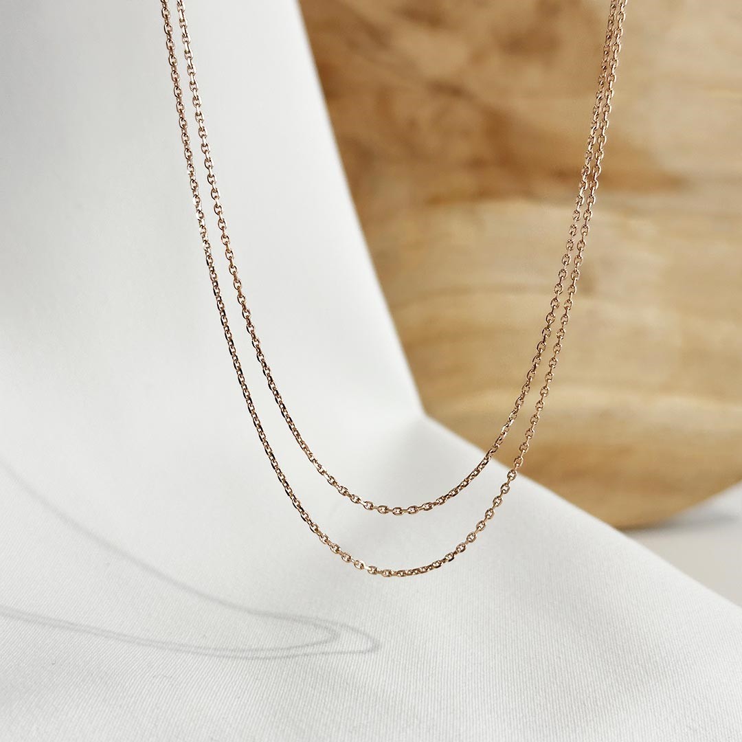 Diese Karreekette aus 750 Roségold fasziniert durch ihr zweireihiges Design, das für eine außergewöhnliche Optik sorgt. Mit einer Länge von 42cm und einer Stärke von 1mm pro Kette liegt sie angenehm am Hals. Die facettierten, ovalen Glieder reflektieren das Licht besonders schön und sorgen für ein dezentes Funkeln. Tipp zur Kettenlänge: Als Orientierung gelten folgende Standardlängen – für Damen meist 42–45cm, für Herren 50–60cm und für Kinder etwa 36–40cm.