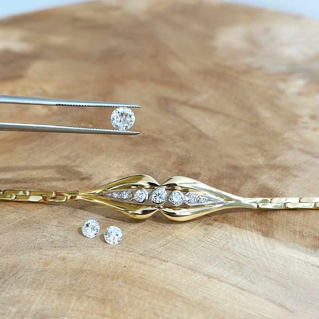 » In der Werkstatt erneuern wir fachgerecht fehlende oder beschädigte Diamanten, Perlen sowie Edel- und Schmucksteine bei Armbändern und Armreifen aus Gold, Weißgold, Roségold und Platin. Unser erfahrenes Team ersetzt Steine in verschiedensten Größen, Farben, Schliffen und Qualitäten, damit Ihr Armschmuck wieder in seiner vollen Pracht erstrahlt. Dazu gehören Edelsteine wie Smaragde, Saphire, Rubine, Tansanite, Aquamarine, Topase und Korallen und viele mehr. Wir arbeiten auch mit verschiedenen Perlenarten wie Akoyaperlen, Süßwasser-Kulturperlen und Tahitiperlen usw. Wir achten darauf, den ursprünglichen Charakter Ihres Schmuckstücks zu bewahren. Vertrauen Sie auf unsere Expertise, um den Glanz und Wert Ihres Armschmuckes zu erhalten.